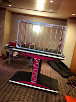Ora pois... uma jaula, uma caixa de esmagamento e uma mesa de cortar as pessoas ao meio. E o mais engraçado que, de facto, nao tinha piada nenhuma, é que quem ia ser posta na jaula, esmagada e cortada ao meio ERA EU. Entrei um bocado em pânico porque só tinha uma hora para aprender a fazer três números de ilusionismo complexos sem orientação... a sorte é que o concorrente a quem calhou esta prova foi ao Pedro Alves, o famoso humorista que faz parceria com o João Paulo Rodrigues. E portanto, o meu "mágico" era uma pessoa com uma capacidade incrivel de me meter à vontade e com confiante, assim como o resto dos concorrentes que estiveram no ensaio para nos apoiar :P