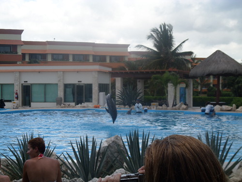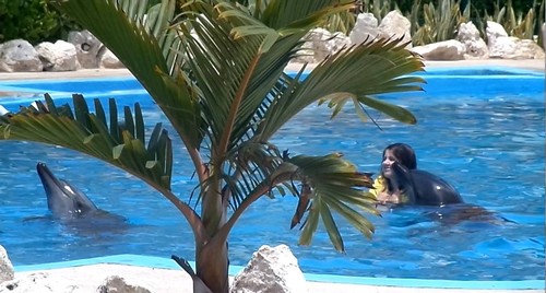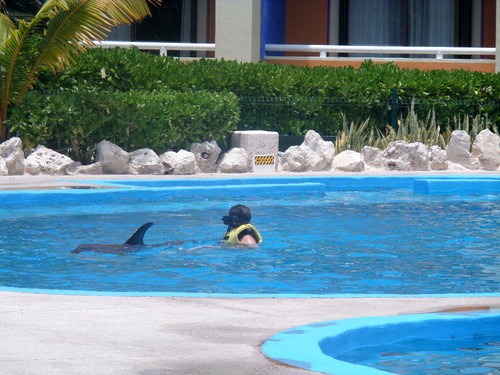 Naquele que sería o penúltimo dia no Resort Grand Bahía Príncipe, estava agendada a concretização de um pequeno sonho, que tinha desde pequenina: nadar com golfinhos. Morria de inveja das crianças que tinham a oportunidade de lhes tocar, no Jardim Zoológico. E quando soube do programa de "Nadar com golfinhos" no Zoomarine, tratei de pesquisar sobre o assunto, mas achei uma exurbitância de preço, para a meia hora que nos proporcionavam. Assim, quando cheguei ao México e me apercebi de que havia esse mesmo programa com uma duração maior e a um preço mais barato, vi que ali tinha (finalmente!) a minha oportunidade. O melhor de tudo é que ainda conseguir MAIS barato do que estava, com muito jeitinho para regatear um preço justo por fazermos um número maior de excursões do que a maioria das pessoas.
